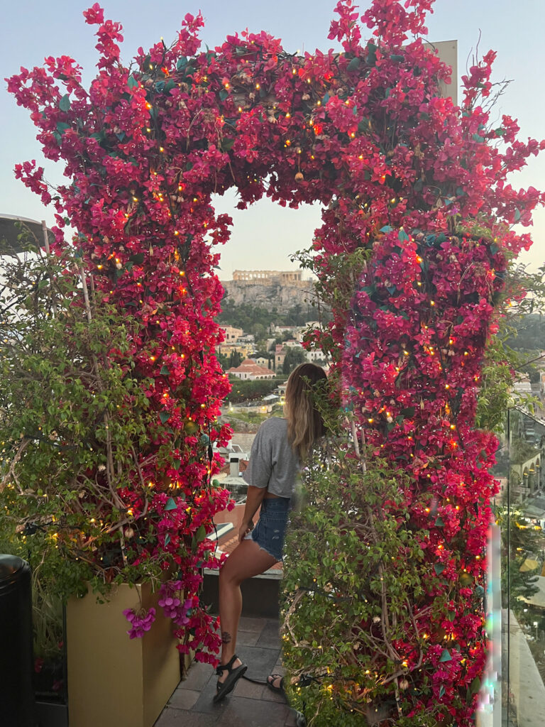 There are a variety of rooftop bars to explore when in Athens. This one was our favorite because of the amazing view of the Acropolis. The flower archway was the perfect photo-op! Drinks were slightly more expensive than on the street below. The drinks ranged from beer to unique cocktails. It is recommended to go in the evening to watch the sunset.